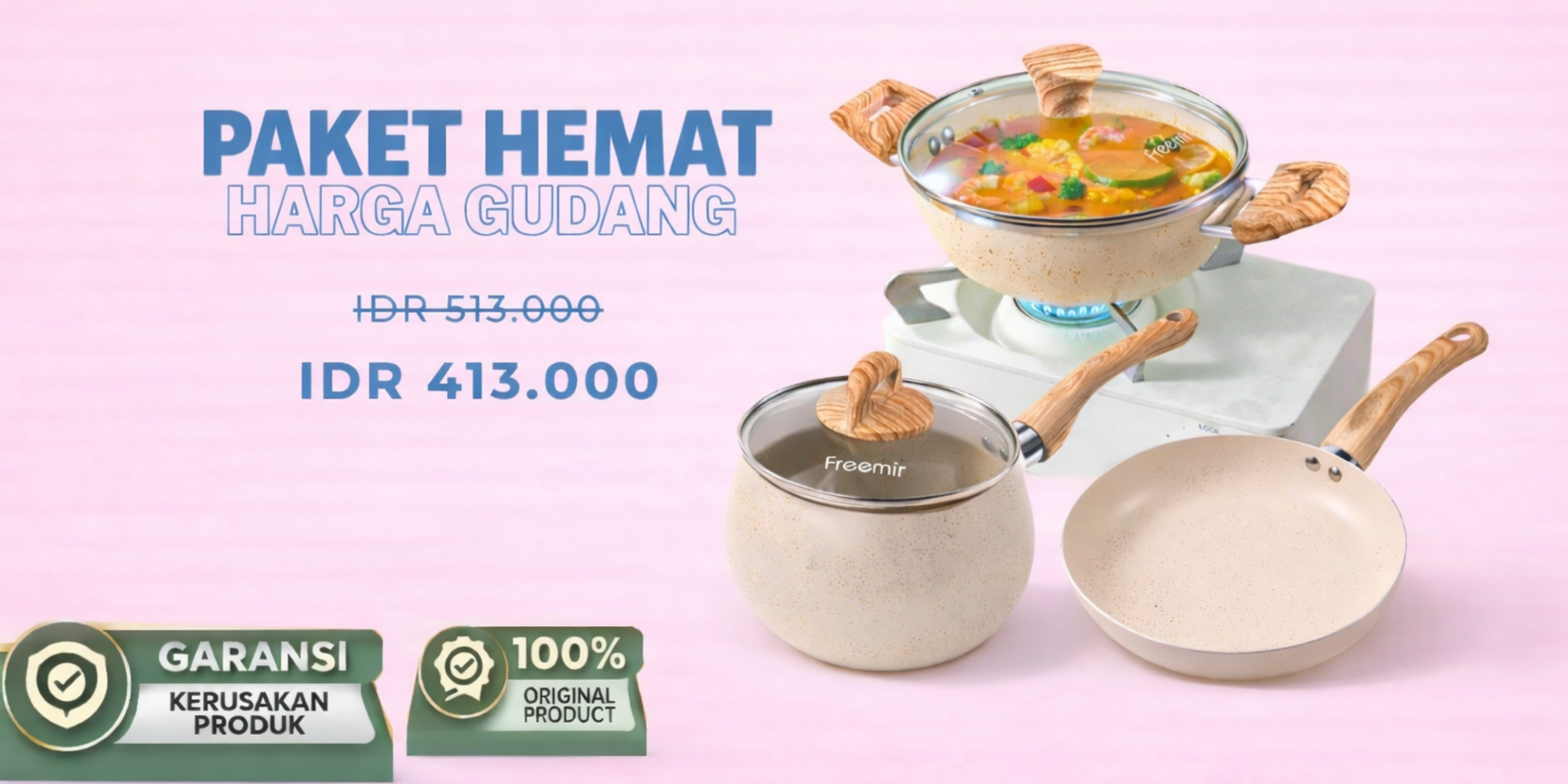 freemir Wajan 24 CM Anti Lengket Micro Pressure Dua Gagang Kayu dengan Tutup Kaca
