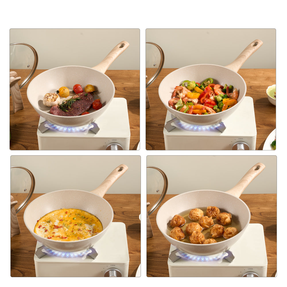 Designed to combine modern style and high performance in one elegant cookware. Made of high-quality 3003# aluminum alloy , this pan features a water-based (eco-friendly) double non-stick coating that ensures food doesn't stick and is easy to clean.