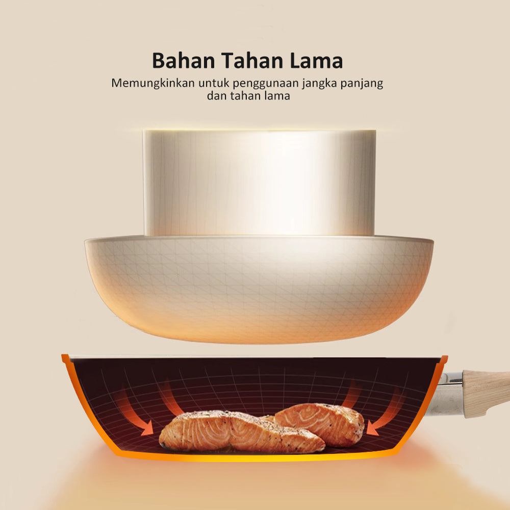 The double bottom structure helps distribute heat more evenly and increases cooking efficiency. The wood-patterned Bakelite handle and lid knob add comfort and a natural aesthetic.