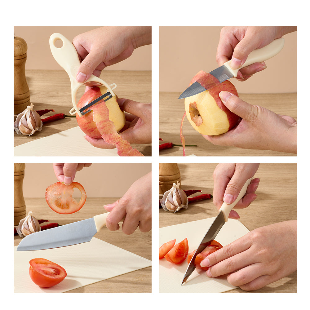 Set pisau dapur Freemir Fruit Knives 5pcs hadir dengan desain minimalis warna krem yang elegan. Terbuat dari bahan PP berkualitas dan stainless steel anti karat, set ini mencakup berbagai jenis pisau serbaguna serta talenan yang praktis untuk kebutuhan dapur sehari-hari. Setiap pisau dilengkapi dengan ukiran logo laser "Freemir", menampilkan kualitas dan keaslian produk.
