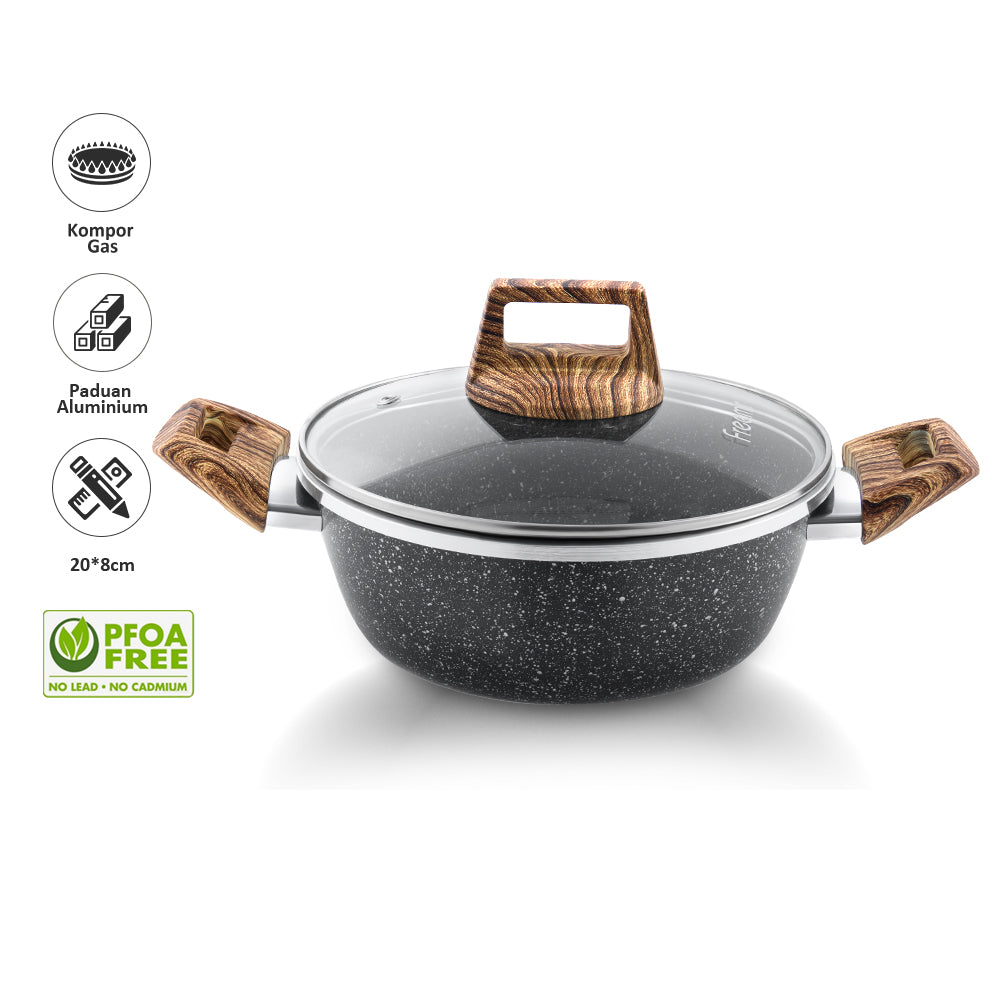 Dibalut warna hitam bermotif marmer dengan sentuhan kayu pada pegangan, tampilannya elegan dan cocok untuk dapur modern. Lapisan dalam dan luar menggunakan coating berbasis air dari Hantian, ramah lingkungan dan aman untuk makanan.